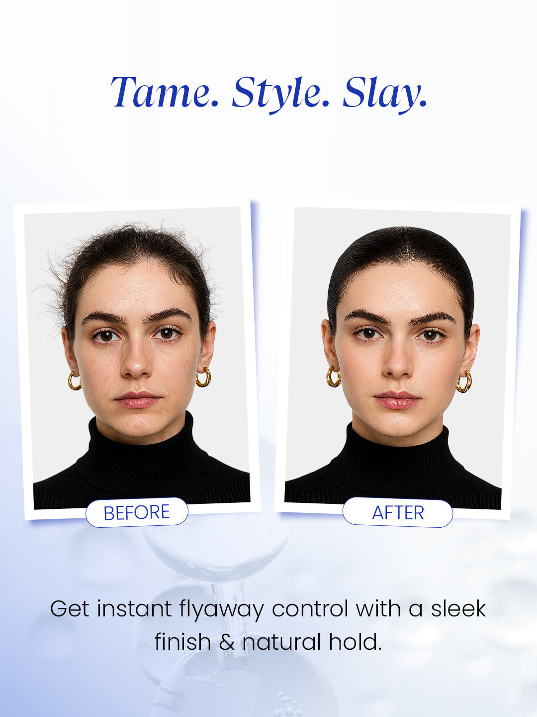 - Tames flyaways and frizz instantly