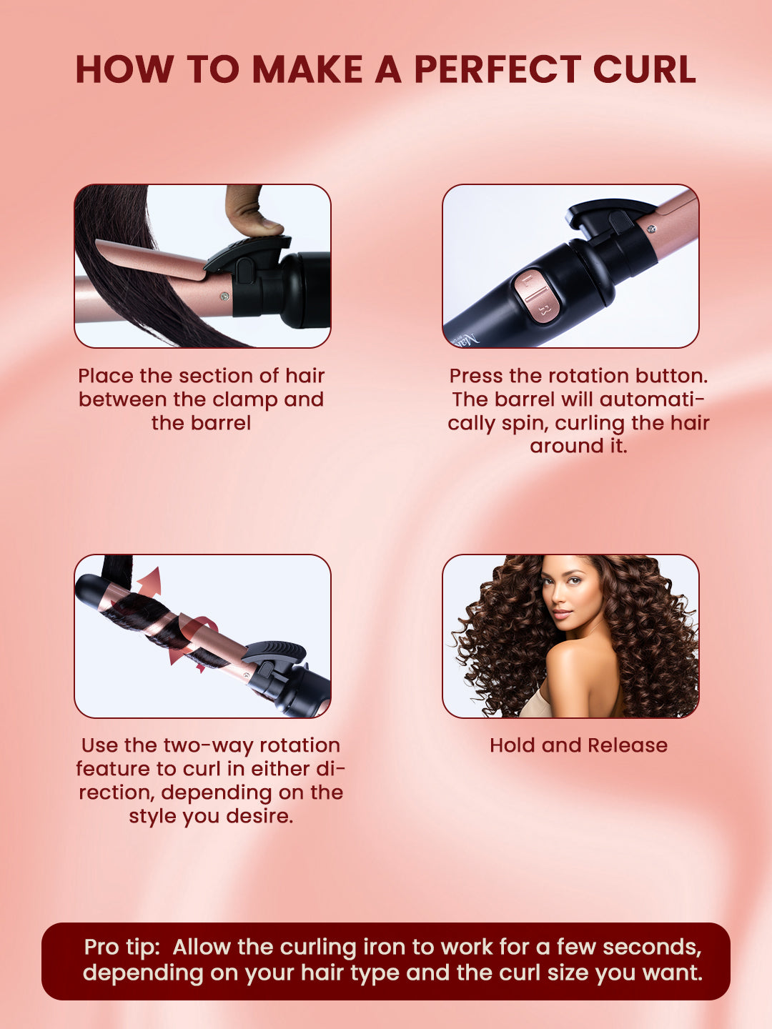 2. Two-Way Curling Rotation for Versatile Styling : Create dynamic curls effortlessly with the two-way rotating feature that allows both left and right curls. Style your hair with ease, whether you prefer tight curls, loose waves, or anything in between.